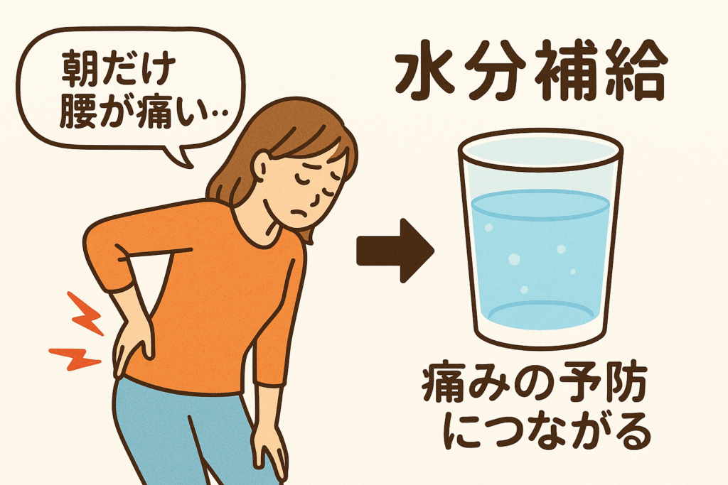 寝ている間に汗や呼吸で水分が失われます。水分が不足すると、関節や筋肉の柔軟性が下がり、血流も悪くなるため、朝の腰痛や首こり、関節痛が出やすくなることがあります。